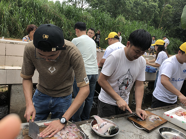 中午時分,便是野炊。所有團(tuán)隊(duì)人員,爭先搶著擇菜,洗菜,切菜,個個上心,心靈手巧,神情專注,像柔指在琴弦上滑動,在琴鍵上跳動,那些菜在他們手上簡直就是蝴蝶、蜻蜓、花朵,一劃一撥,簡直是在寫詩。如此曼妙,此景只有人間樂,誰聞天堂有此景。做菜烹調(diào)是難事,也是易事。說難,菜到什么味口,是有級別的,那是廚師的事,說易,人人搶著炒菜,沒誰說不好,照樣吃得津津有味,興趣盎然,好味,好味……一桌十幾樣菜,花花綠綠,群星燦爛,是勞動成果,是智慧結(jié)晶,亦如我們團(tuán)隊(duì)業(yè)務(wù)上的成果,耀眼、驕人……